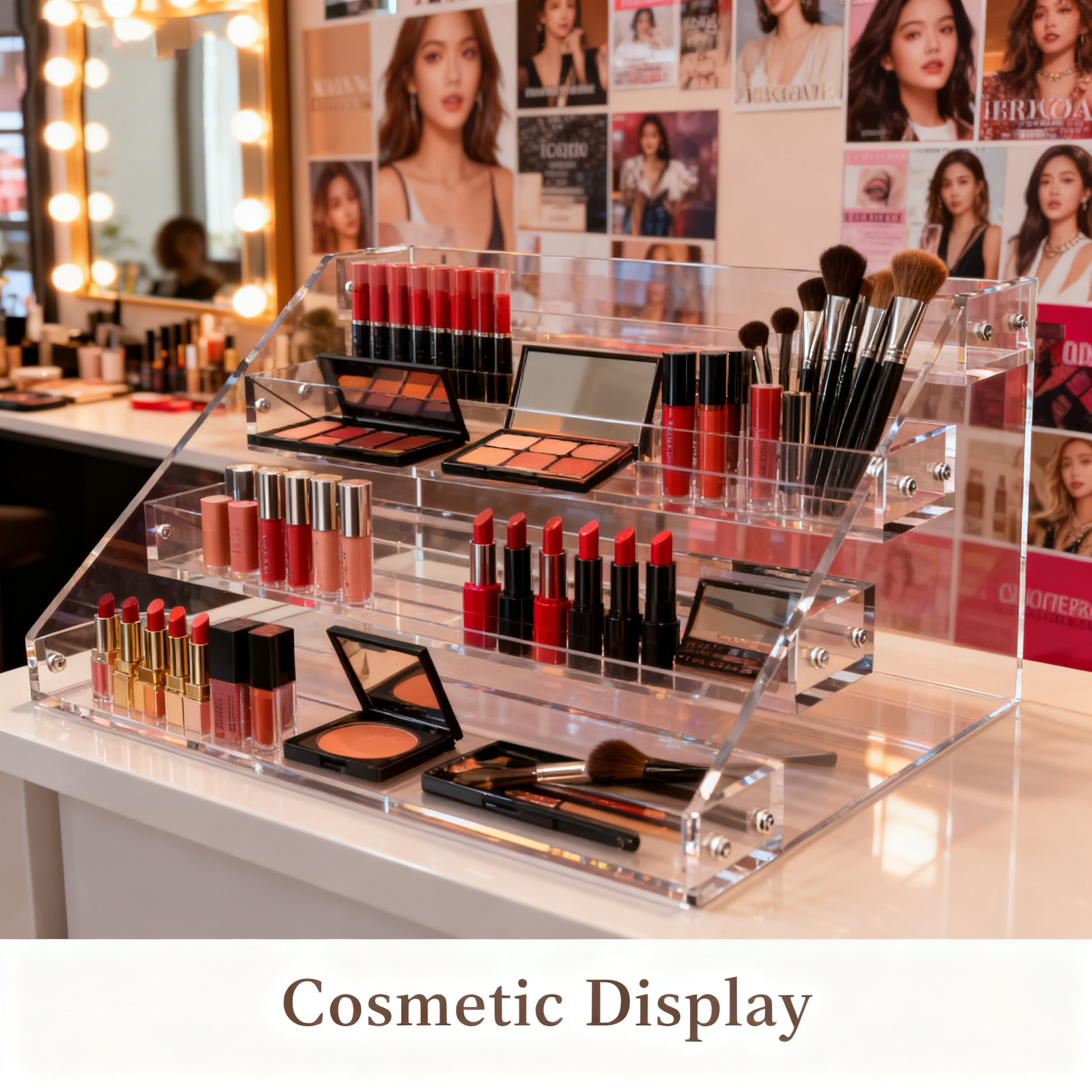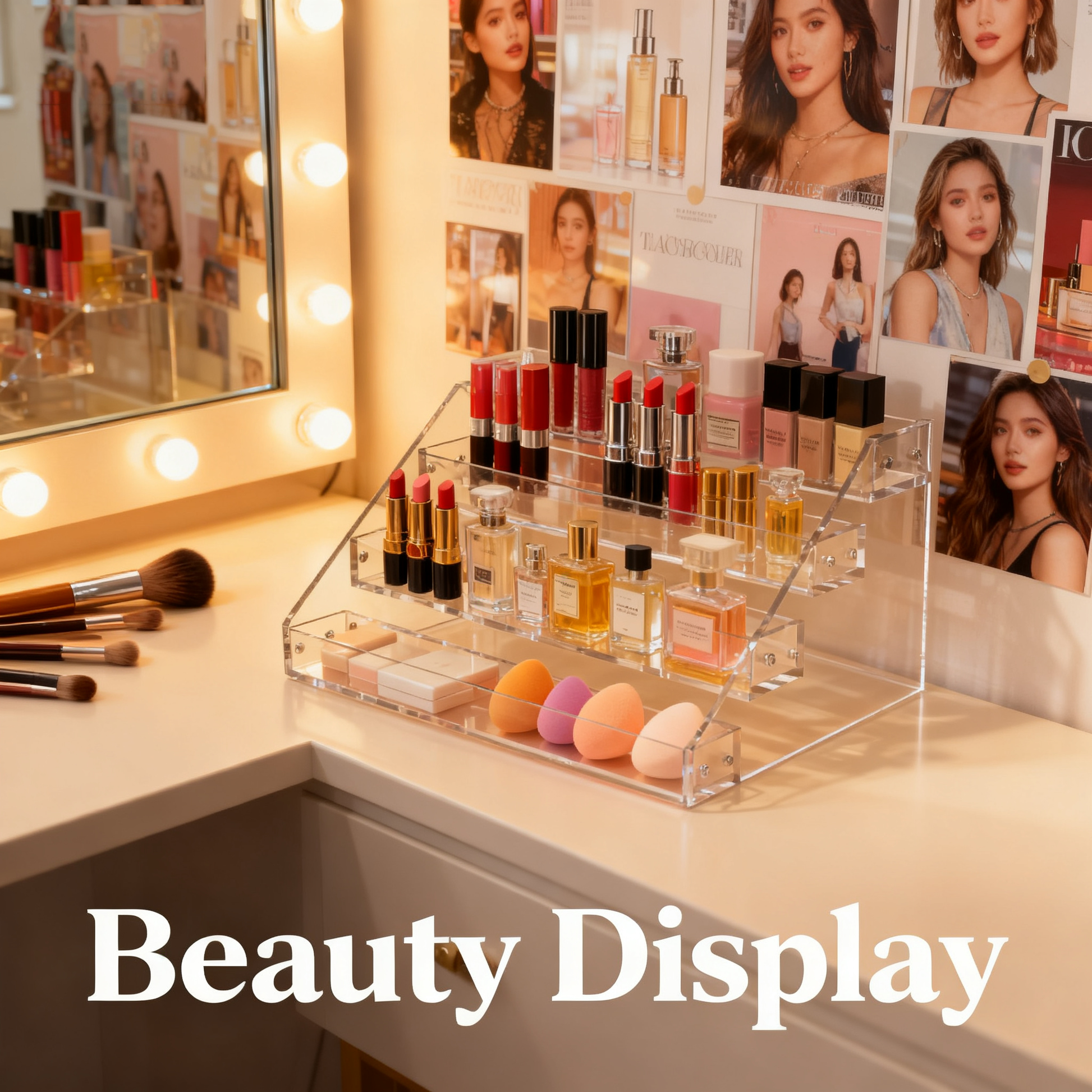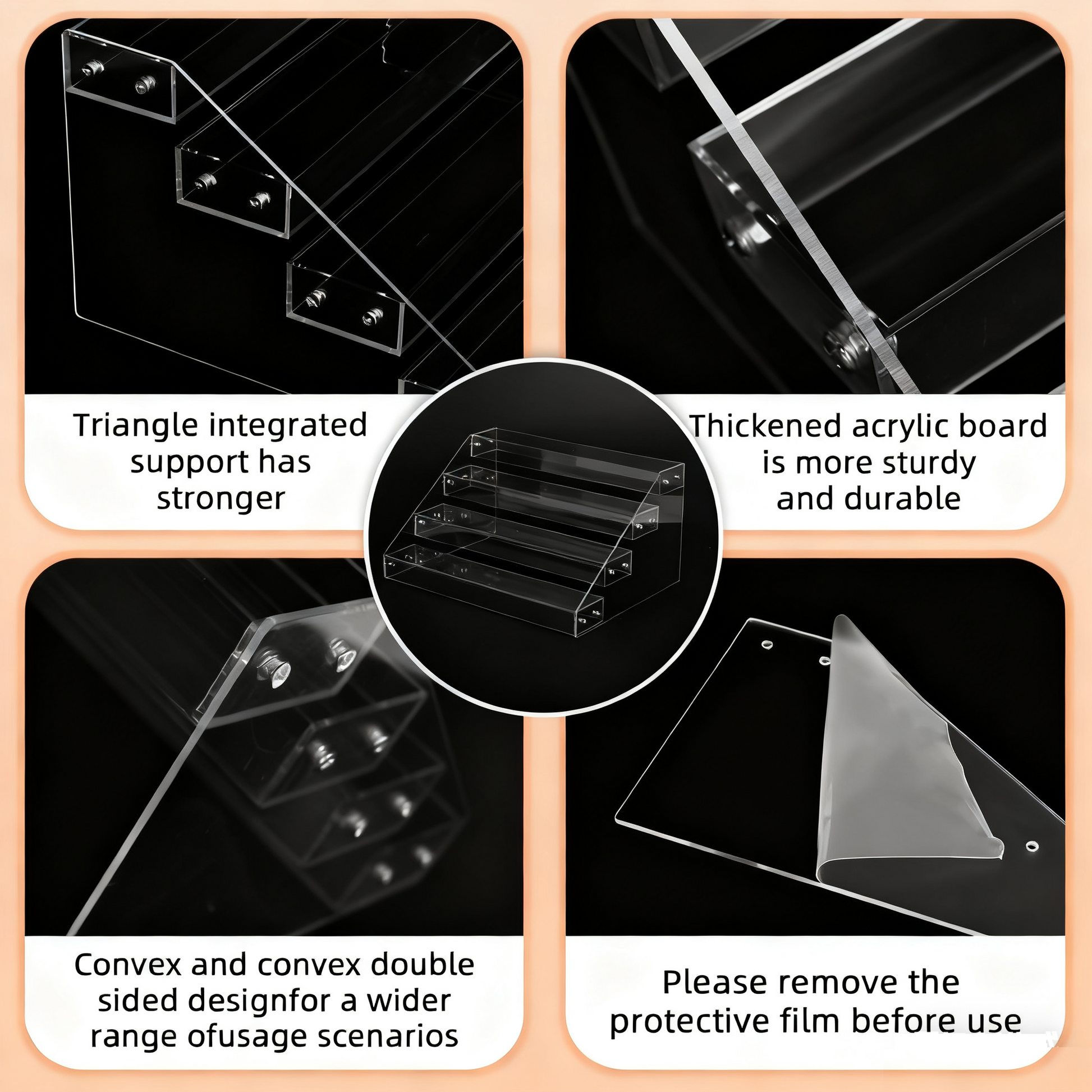 Featuring a unique four-layer stepped structure, this acrylic riser can be used on both sides. The flat side is ideal for displaying larger items like perfumes, cosmetics, or collectible figures, while the concave side securely holds smaller bottles or standard-size makeup to prevent slipping and rolling. Flexible for every display need.