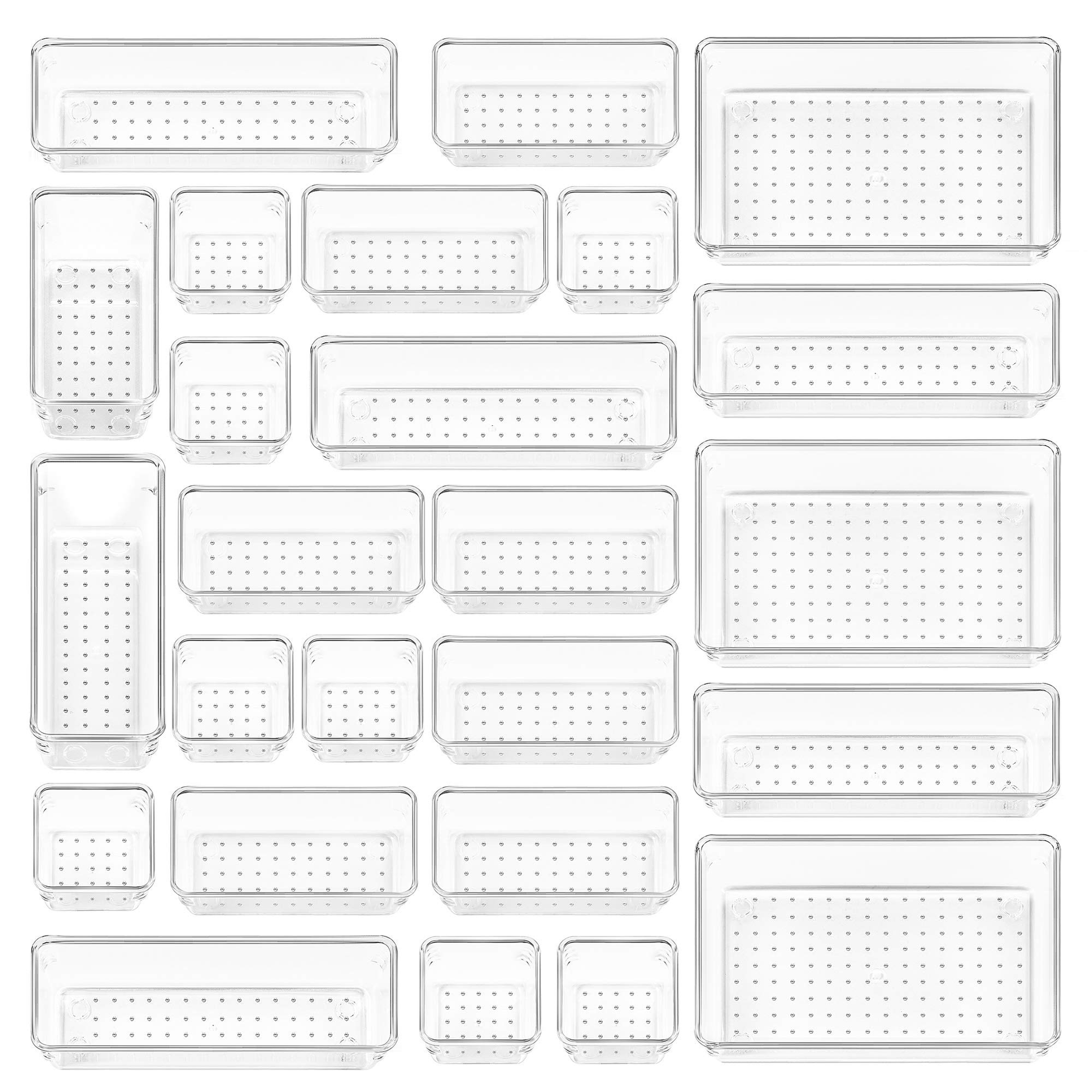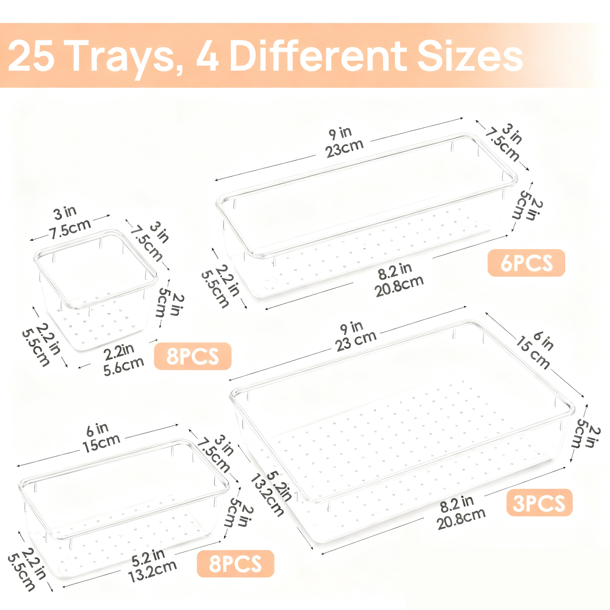 Acrylic Clear Versatile Drawer Organizer Set 25-Piece, 4-Size Transparent Trays for Makeup, Jewelry, Kitchen & Office Drawers Organizer Box,Non-Slip Silicone Pads Included