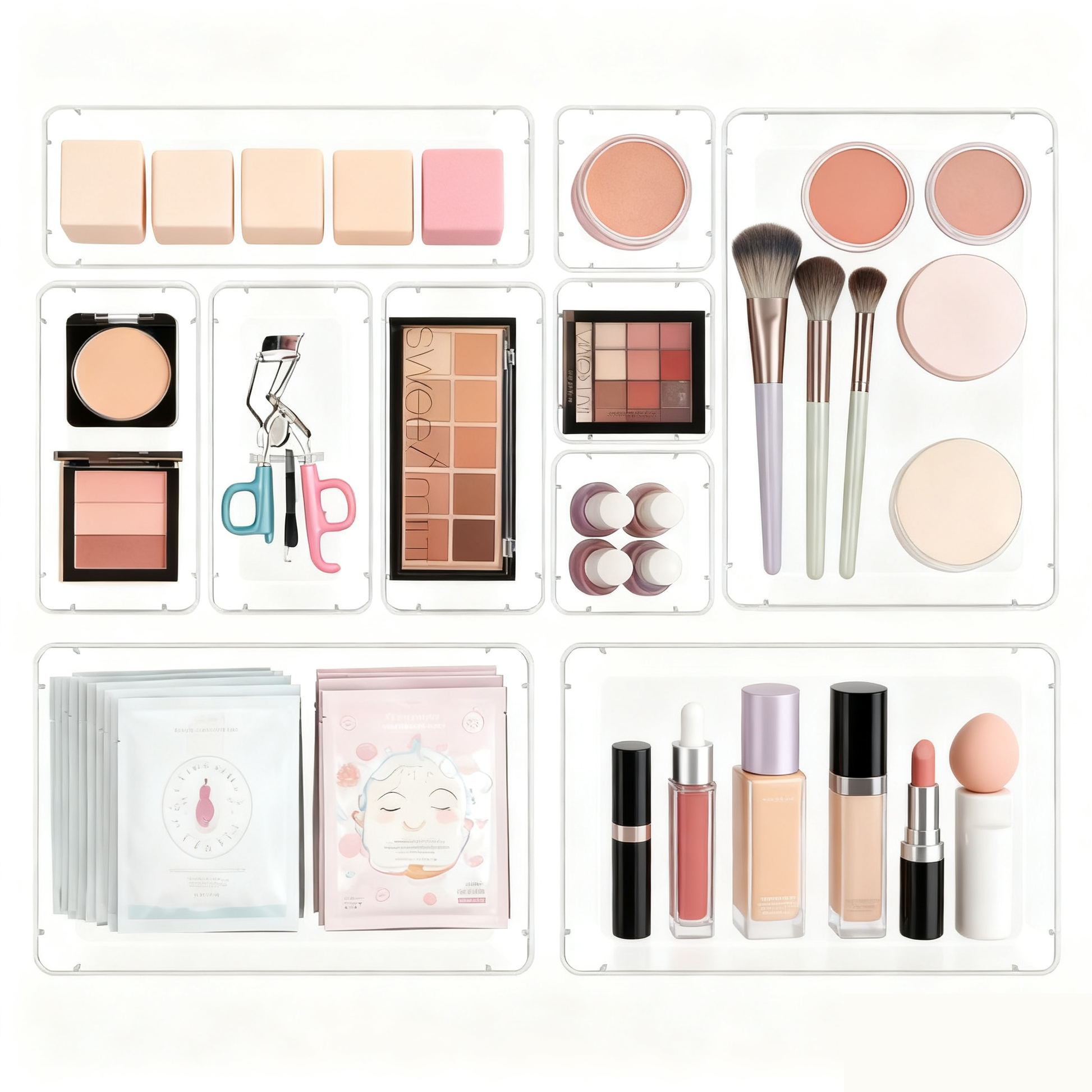 This complete set includes 25 transparent trays in 4 different sizes, offering flexible combinations to fit drawers of all shapes and sizes. Perfect for organizing cosmetics, utensils, stationery, and small household items.