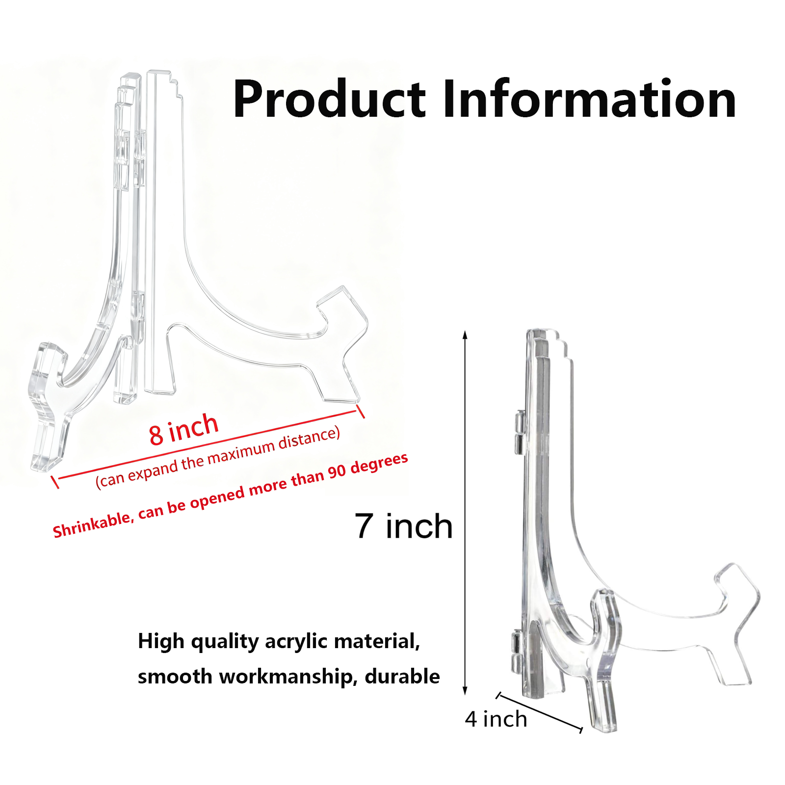 Each display holder measures 7 inches in height and expands up to 8 inches in width. For best stability, please do not exceed the maximum open width. The transparent structure complements any décor while keeping the focus on the displayed item.