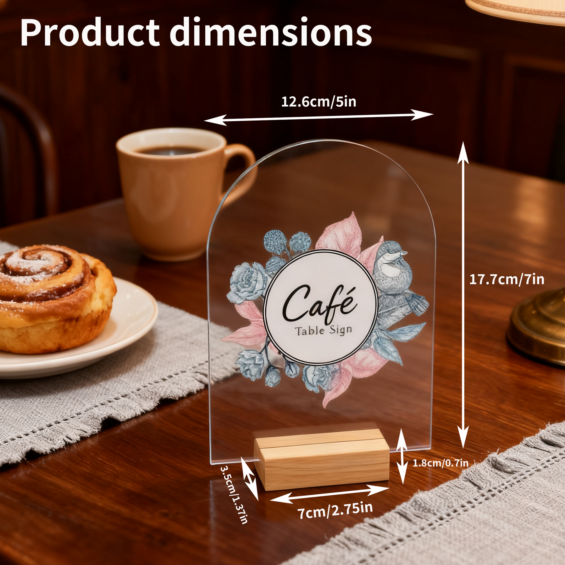 Each acrylic sign measures 5 × 7 inches, perfectly paired with a wooden base measuring 2.75" × 1.37" × 0.7" and a snug slot of 0.07" × 0.35". The precise fit ensures your cards, photos, or table numbers stay upright and secure throughout your event.