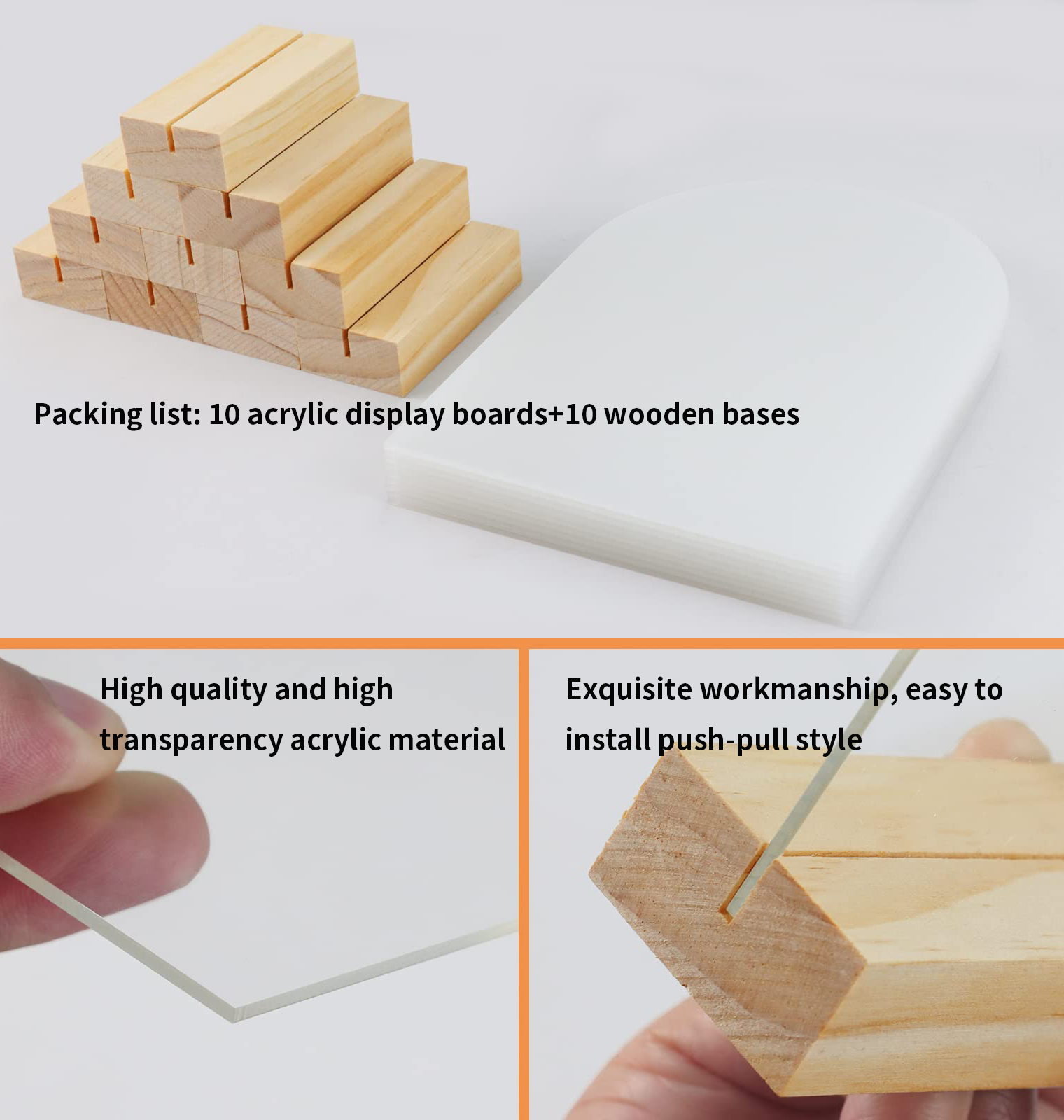 Crafted from premium clear acrylic with smooth, rounded edges for a modern minimalist look. The solid wooden stands are natural, odor-free, and finely polished to complement any décor style—from rustic to contemporary—while ensuring long-lasting use.