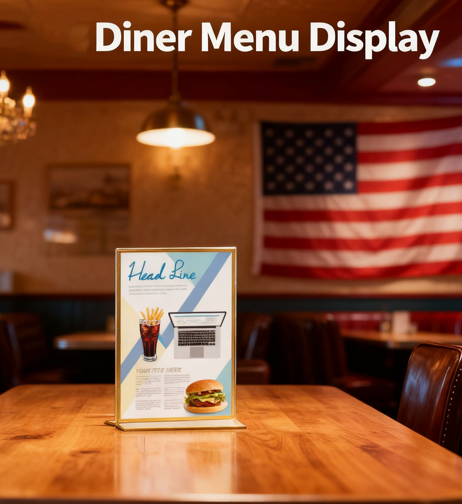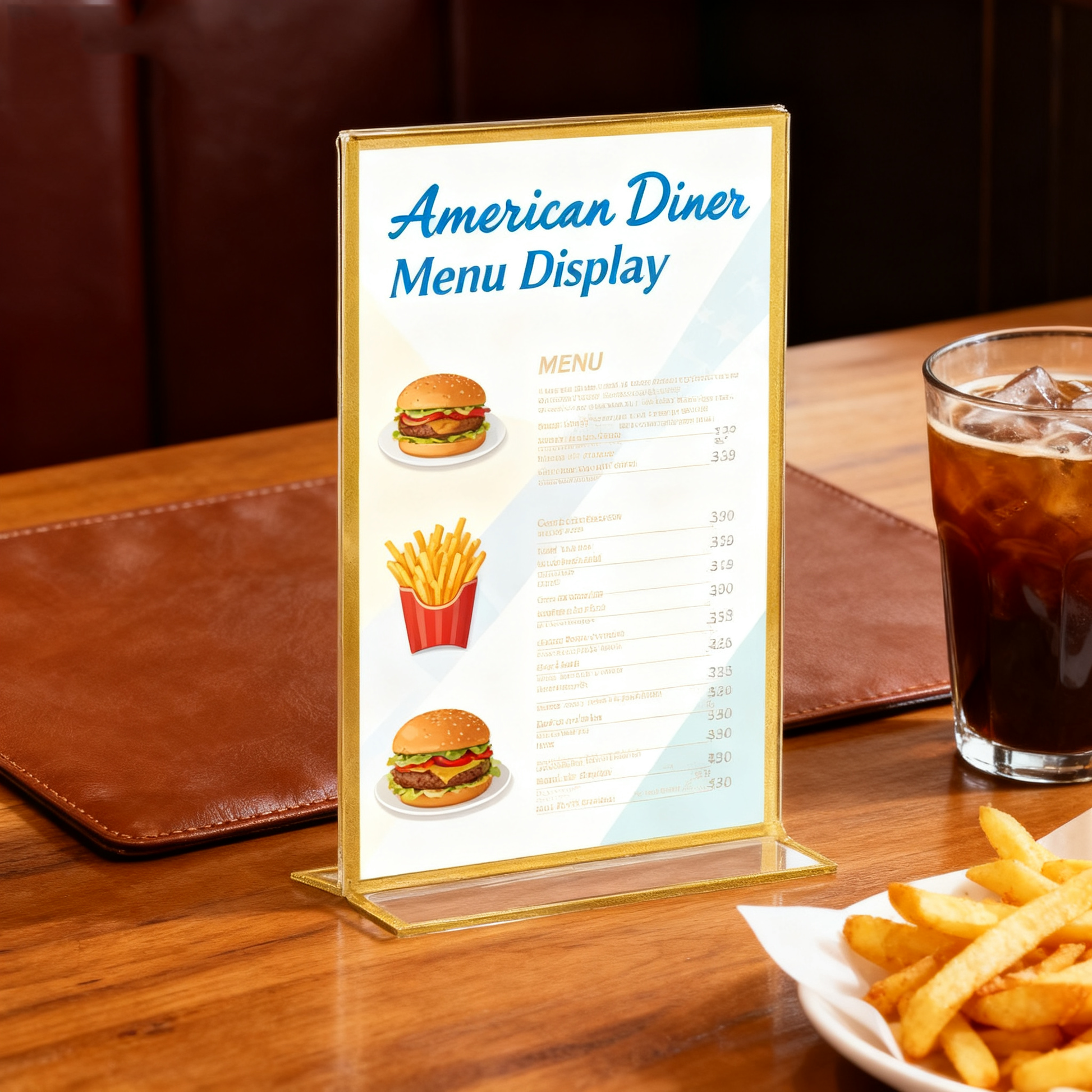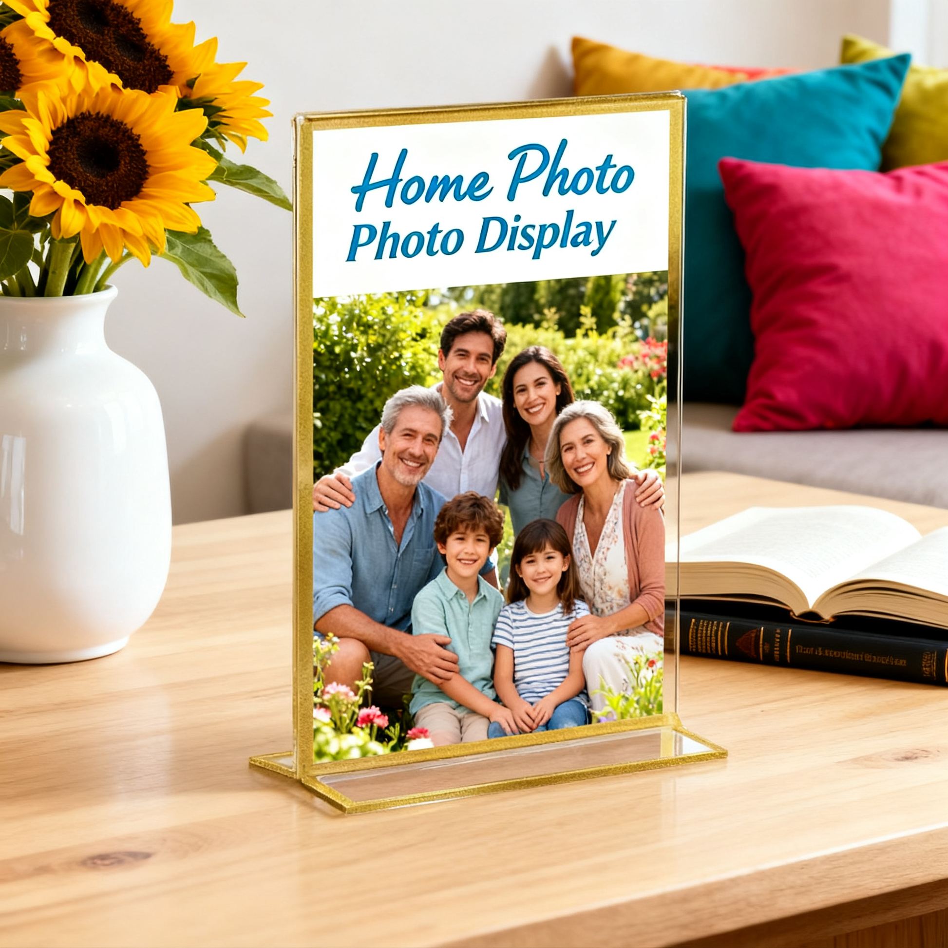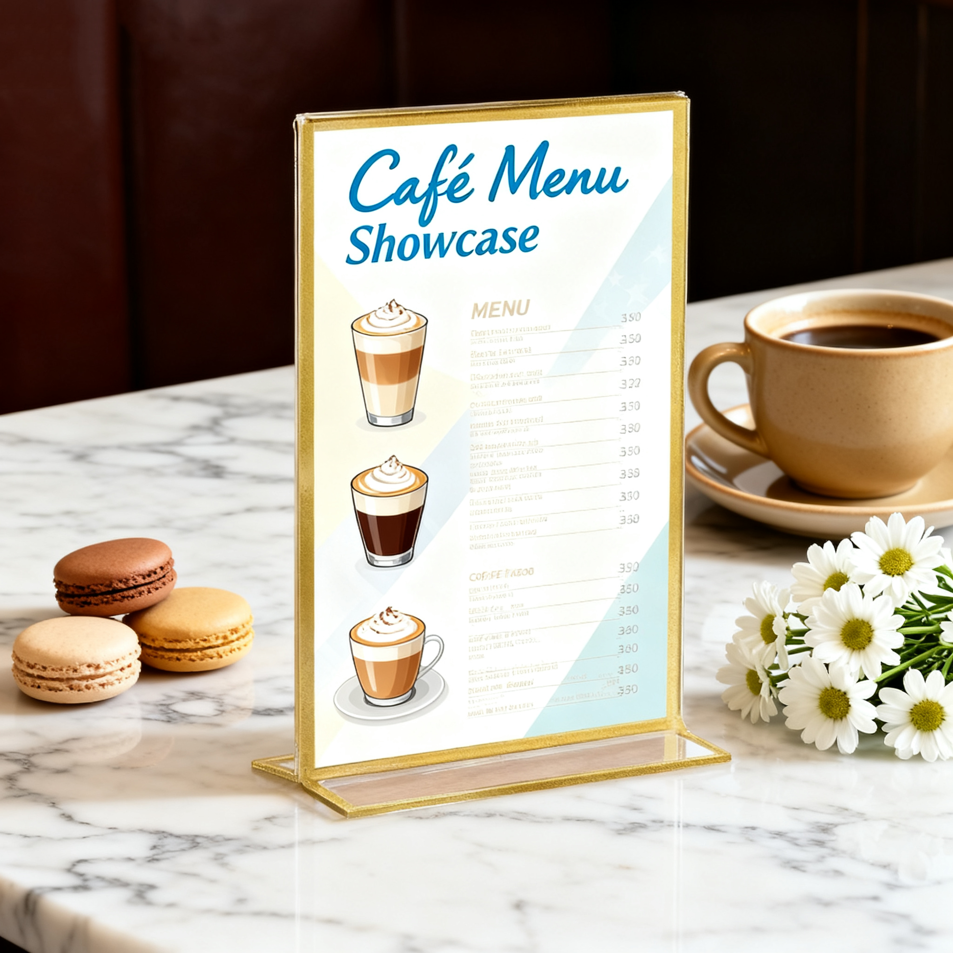 Crafted from premium, thick acrylic with a sleek gold edge, these clear display stands are sturdy, shatter-resistant, and designed for long-term use. They maintain their clarity over time, ensuring your photos, menus, and signs always look their best.