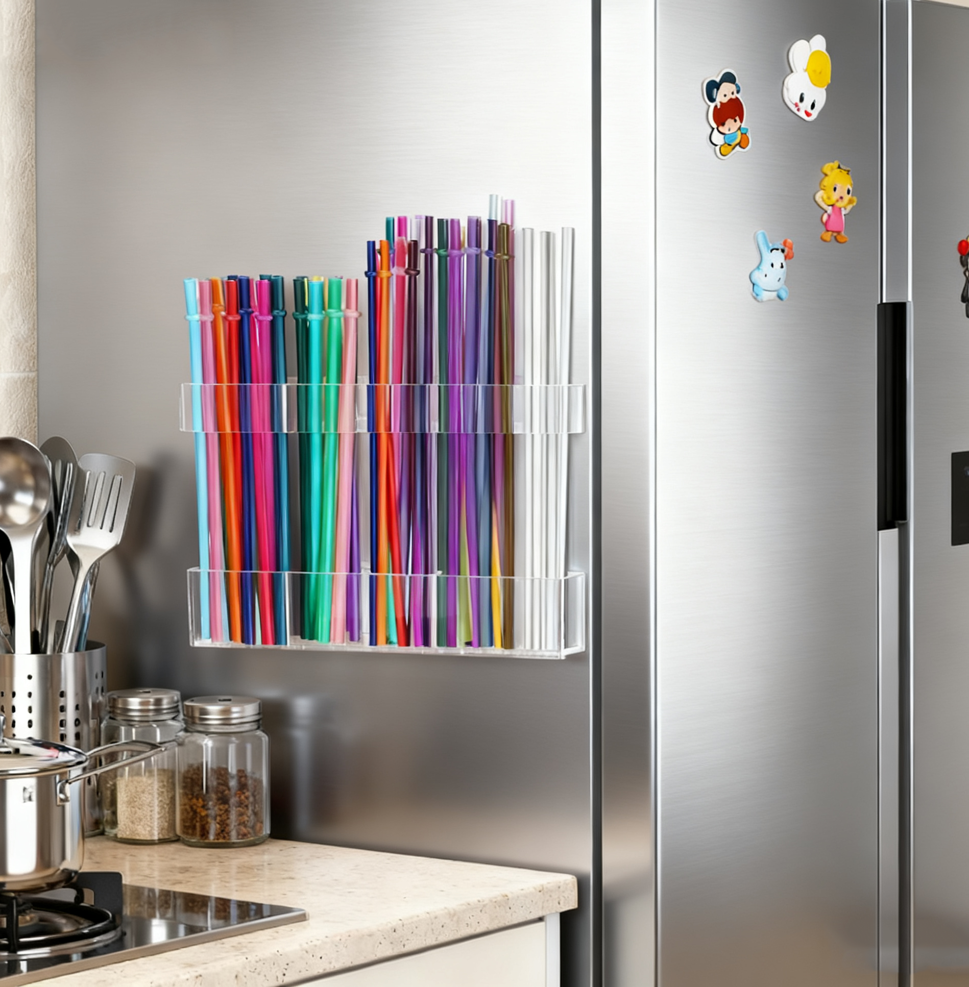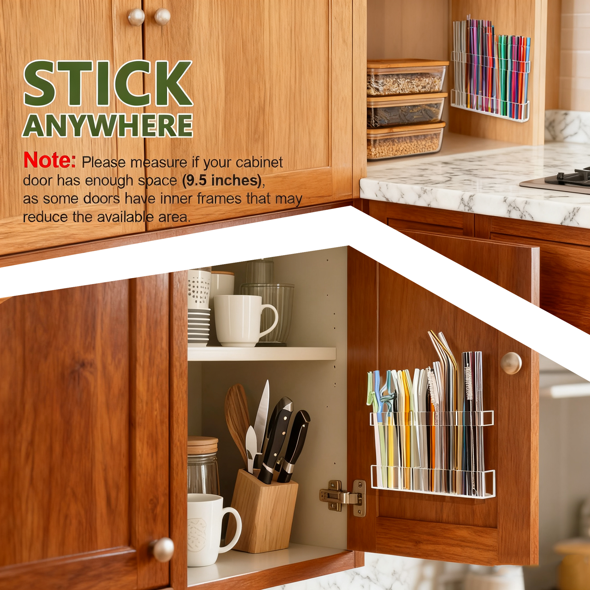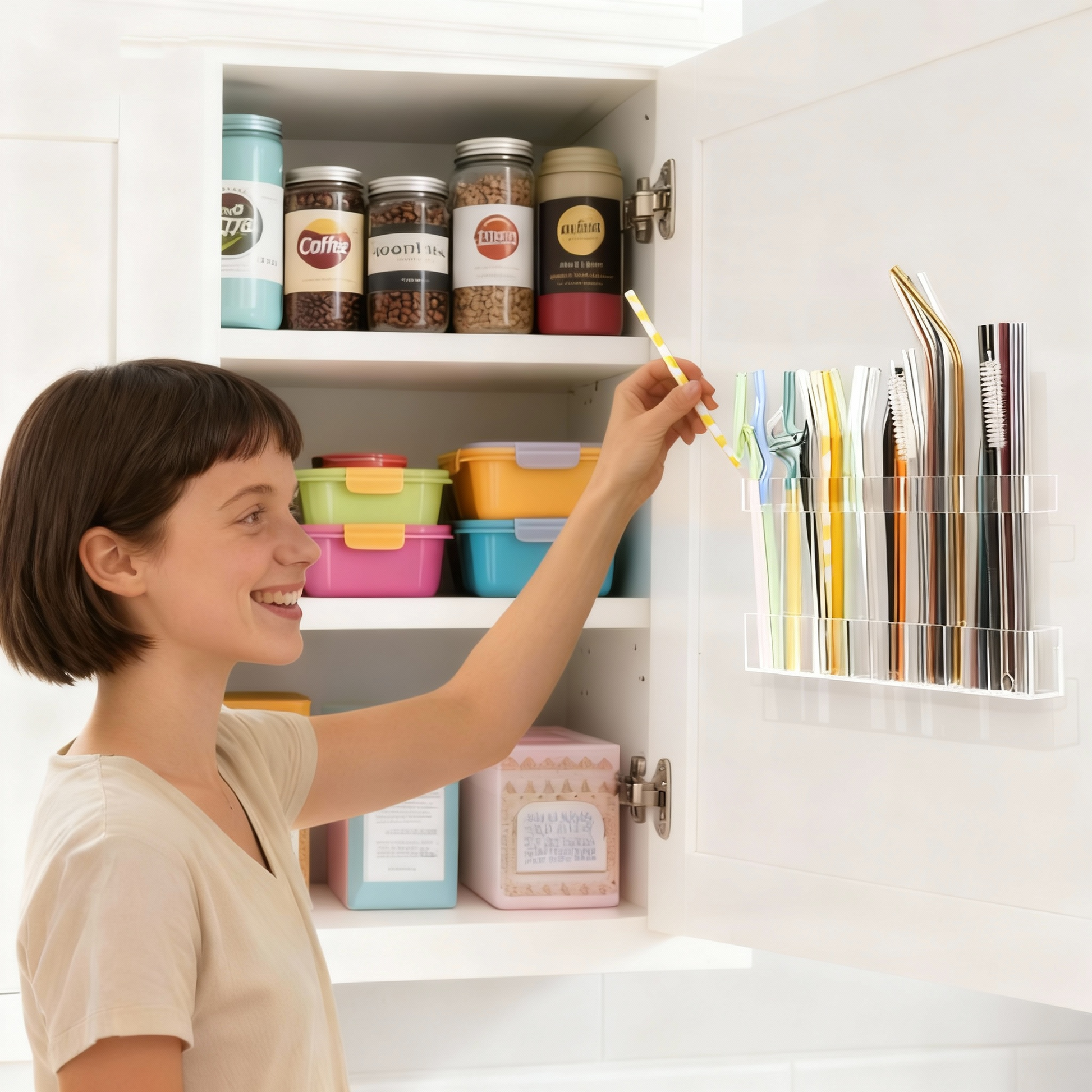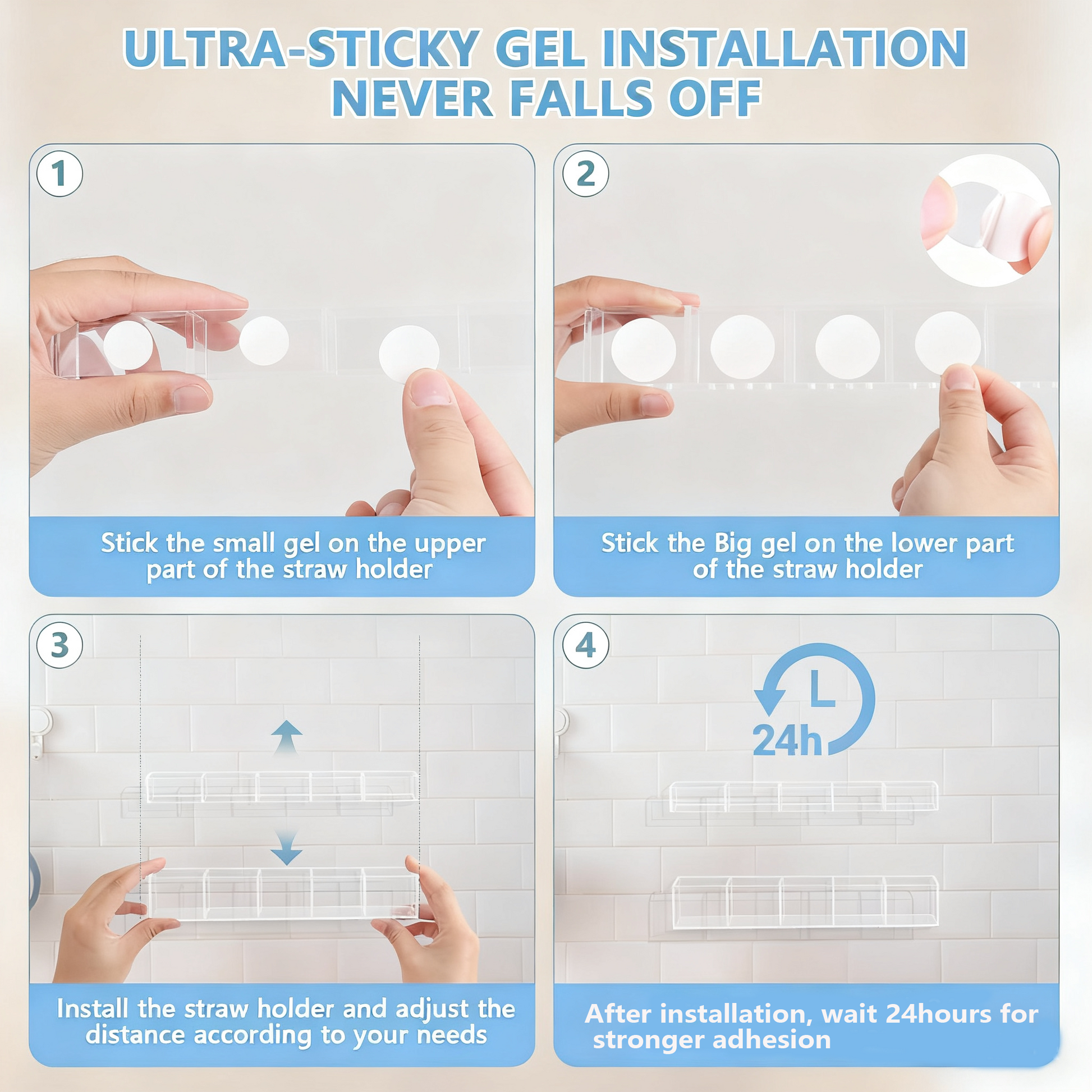 Extra-strong nano gel pads keep the organizer firmly in place for a stable, reliable hold without falling. Tip: For best results, first use your own regular tape to temporarily secure the two acrylic modules inside the cabinet, ensuring the spacing fits your straws and does not affect the door’s opening or closing. Once confirmed, attach with the included nano gel pads.
